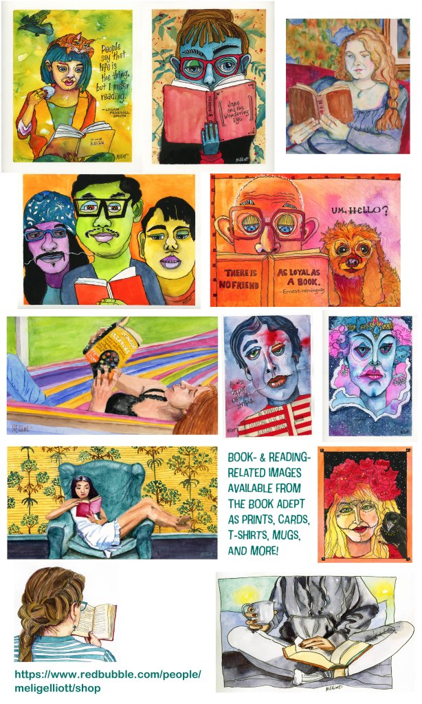 A reminder for those who not only enjoy reading but also like talking about it and seeing other people do it: Please visit The Book Adept’s shop, to purchase book- and reading-related images on various products, including prints, cards, and postcards, T-shirts, mugs, and more! While you are there, also check out all the non-reading-related art. The link is: https://www.redbubble.com/people/meligelliott/shop